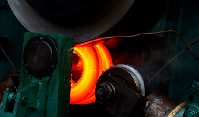 (2)鍛壓、碾壓復(fù)合成型工藝生產(chǎn)的車(chē)輪產(chǎn)品輪孔和輪槽是在壓力作用下碾壓成型的,原材料受到充分利用。與傳統(tǒng)的鍛壓成型工藝比較明顯的降低了原材料消耗,有利于降低成本,提高產(chǎn)品市場(chǎng)競(jìng)爭(zhēng)力;